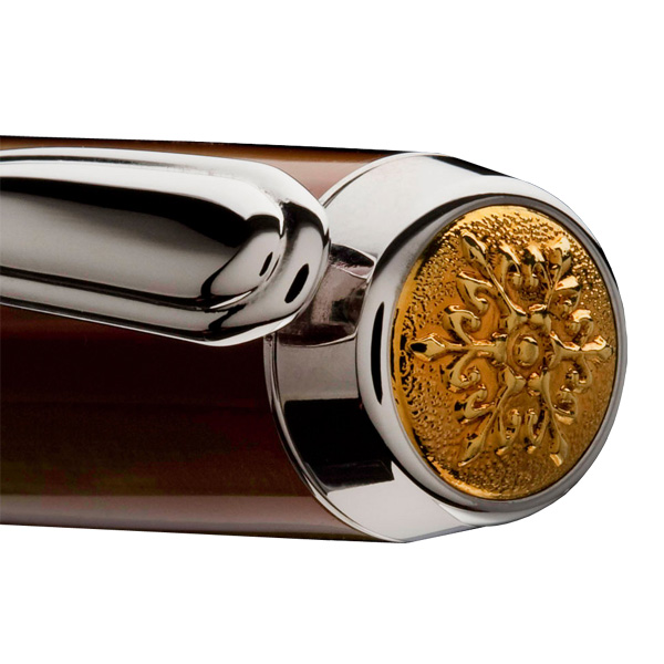Une pastille ciselée ton sur ton, rehausse le haut du capuchon, et la bague centrale est bi-color. Finition absolument parfaite pour ce modèle d'exception. ( A savoir que ce mécanisme existe également en version Senior)