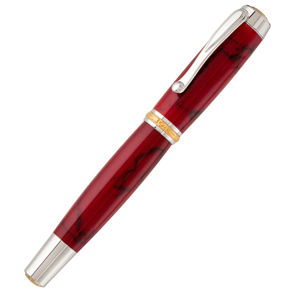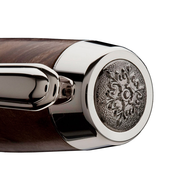 Une pastille ciselée ton sur ton, rehausse le haut du capuchon, et la bague centrale est bi-color. Finition absolument parfaite pour ce modèle d'exception. Plume Schmidt bi-couleur  (made Germanie) plaquée or et pointe iridium