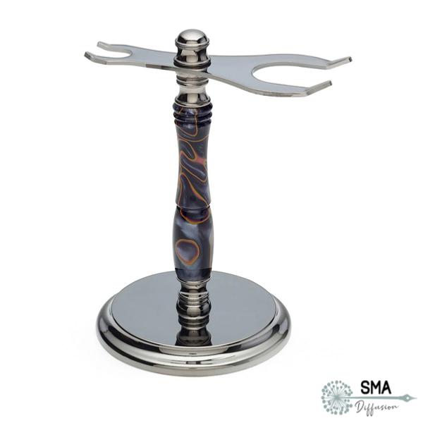 1. Un présentoir de belle facture pour présenter le rasoir et le blaireau serti chrome. Même qualité de chrome que nos 3 rasoirs, chrome (****) et aux cotes adaptées à ceux-ci. Un seul tube à tourner, prévoyez de réserver un morceau de bois pour l'assortir au rasoir et blaireau.